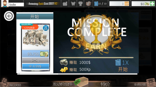 2、自由选择完成任务来赚更多的钱或者参加在线多人对战与其他玩家进行比拼;